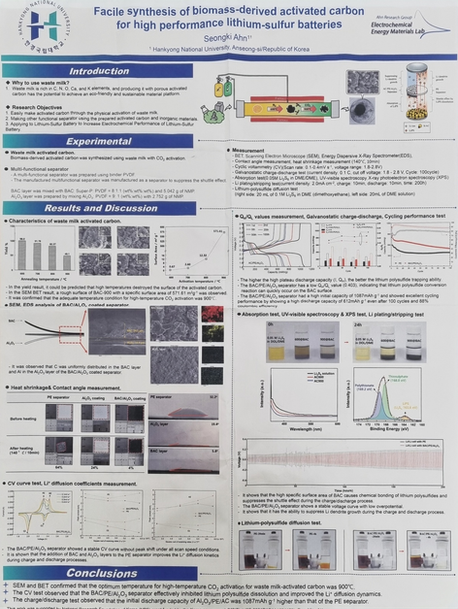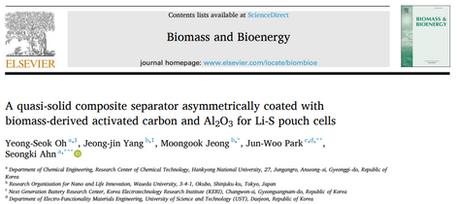 본 연구실 석사학생인 오영석 학생이 제1저자로 참여한 논문 "A quasi-solid composite separator asymmetrically coated with biomass-derived activated carbon and Al2O3 for Li-S pouch cells"이 SCIE 국제학술지인Biomass and Bioenergy (IF 5.8) 에 게재되었습니다. Link: https://www.sciencedirect.com/science/article/pii/S0961953425006737?dgcid=autho